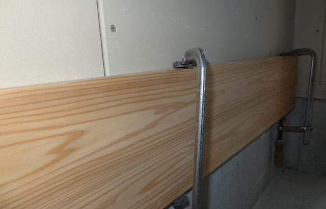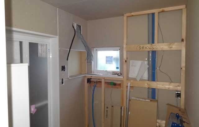 洗面所パイプスペースとニッチの施工中。給排水の配管スペースと洗剤置場の壁埋込型ニッチの施工中です。