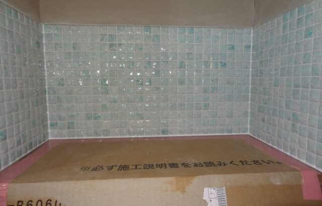 感染防止にも役立つ、玄関の手洗器。モザイクタイル貼り工事完了!カウンターの上に洗面ボールが付きます。(オプション工事)