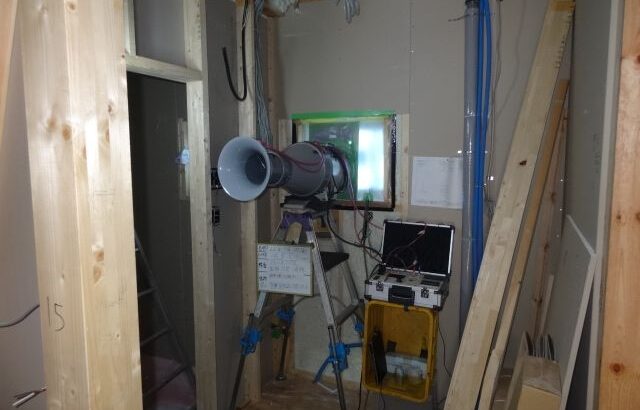 気密測定を行いました。朝8時から、1時間ほど。閉め切った中での気密測定。猛暑のせいもあり、汗びっしょり。