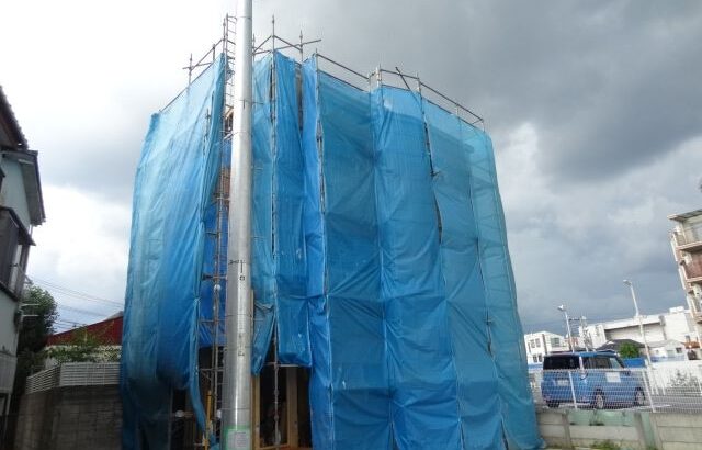 現場はお休みですが、足場の養生シートを貼りました。