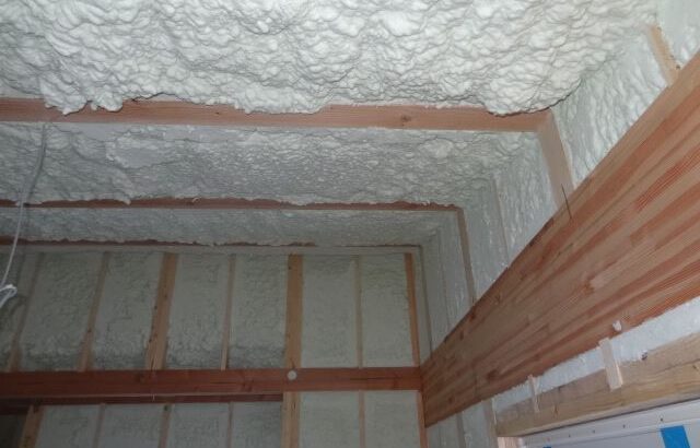 屋根部分と壁の発泡ウレタン断熱工事が完了。明日は床下の断熱工事です。