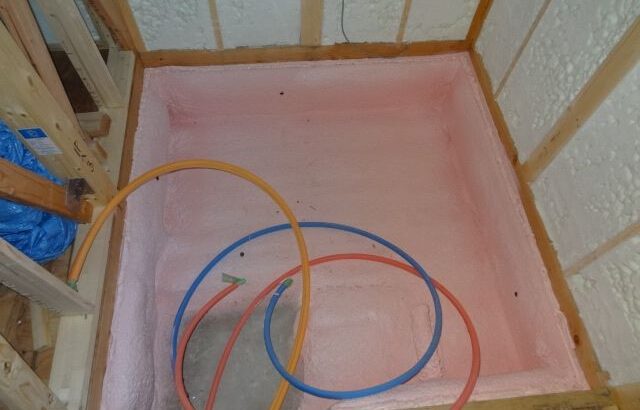 基礎の吹付断熱工事が完了しました。