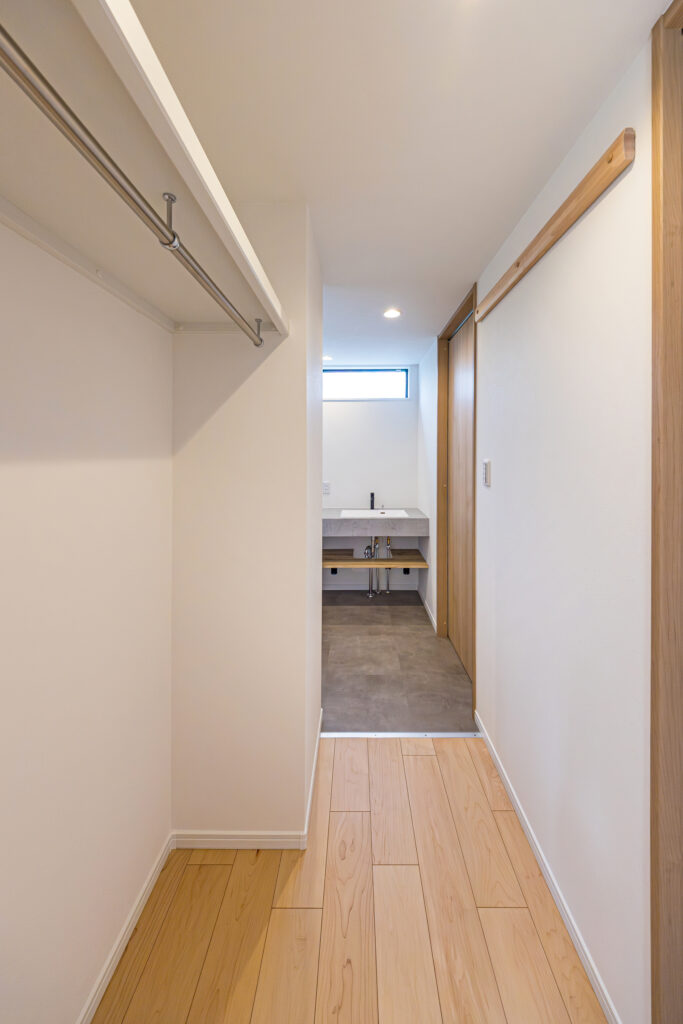 ウォークスルー動線には、壁沿いに収納も設置。